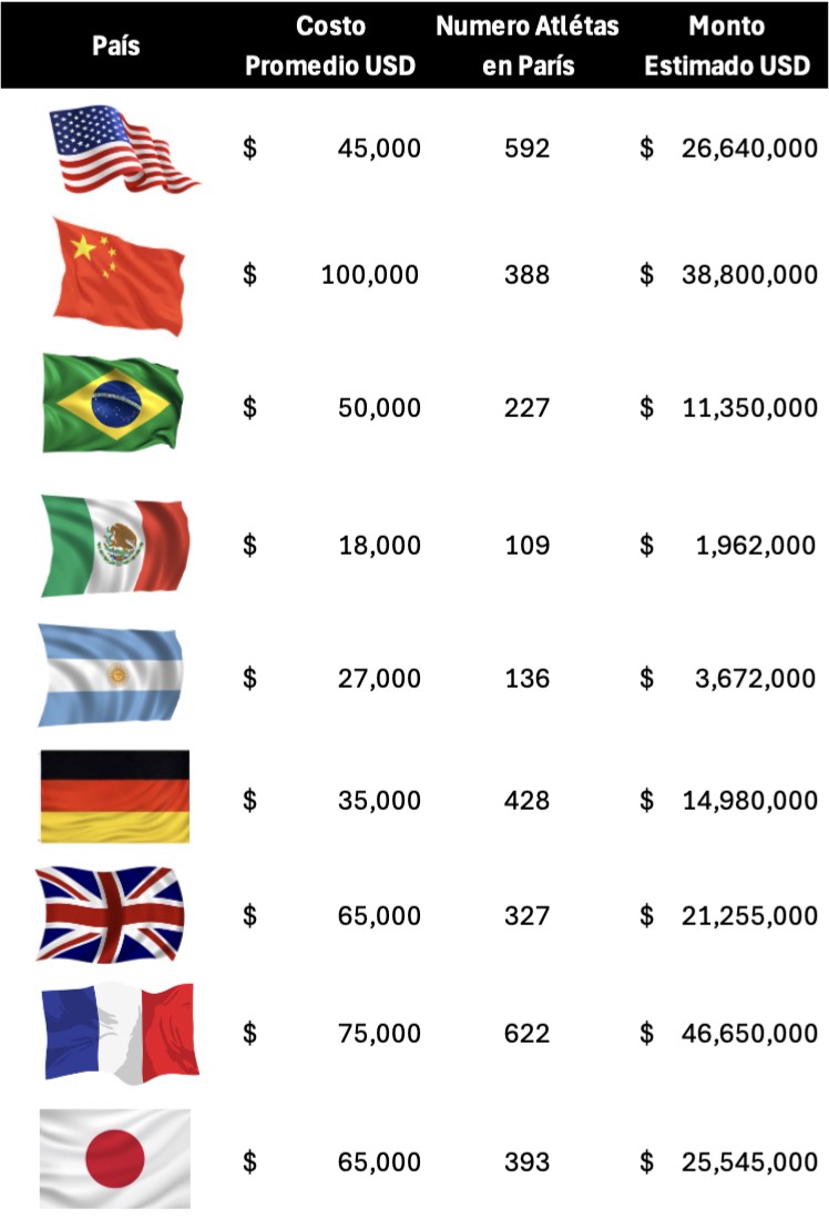 Como en esta columna nos encantan los escenarios, decidimos tomar ejemplos reales del costo de 9 países y un costo promedio que representa el mantenimiento de cada atleta basado en el numero real que asistieron a París.