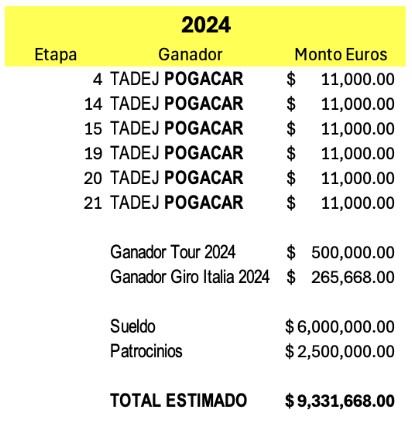 Este 2024 ha conseguido la hasaña de ganar dos de las más importantes tours del ciclismo, Giro de Italia y la Tour de Francia, lo que le arroja ingresos estimados de más de $ 9 MDE.