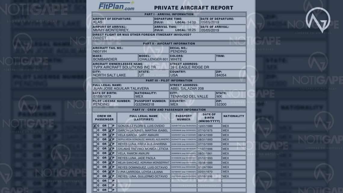 La aeronave partió a las 14:00 horas del domingo desde Las Vegas y su aterrizaje en Nuevo León se estimaba a las 18:25 horas, pero perdieron contacto con la torre de control a unos 280 kilómetros de Monclova, Coahuila.