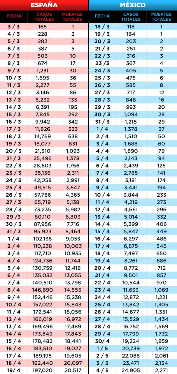 En plena Fase 3, en México ya suman 2,271 personas fallecidas por covid-19, informó la Secretaría de Salud en el reporte técnico diario que se da a conocer en la conferencia de prensa vespertina. En el país se tiene un registro de 24 mil 905 casos confirmados por el coronavirus, de los cuales 6,696 son los casos activos, es decir, los contagiados en los últimos 14 días.