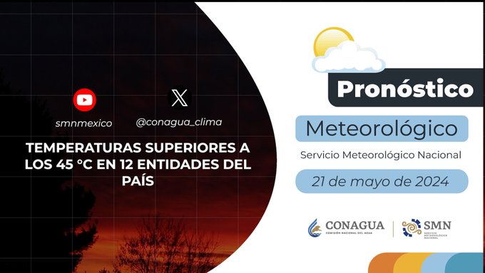 Debido a la tercer ola de calor se prevén temperaturas máximas en varias regiones del país. Se espera que los estados de Campeche, Coahuila, Guerrero, Michoacán, Morelos, Nuevo León, San Luis Potosí, Sinaloa, Tabasco, Tamaulipas, Veracruz y Yucatán registren máximas a los 45 grados Celsius.