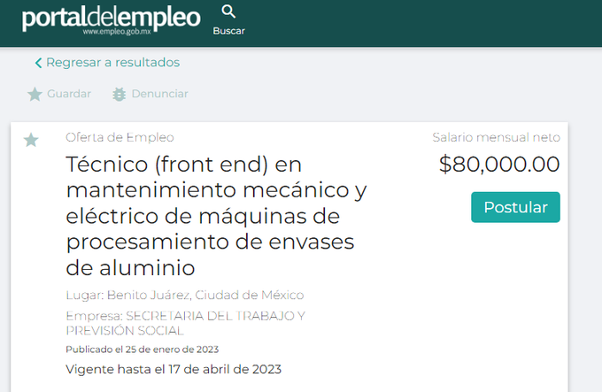 A través del portal de internet de la Unidad del Servicio Nacional de Empleo se publicó el pasado 25 de enero una oferta de empleo para técnico en mantenimiento mecánico y eléctrico de máquinas de procesamiento de envases de aluminio con un salario mensual de 80 mil pesos.
