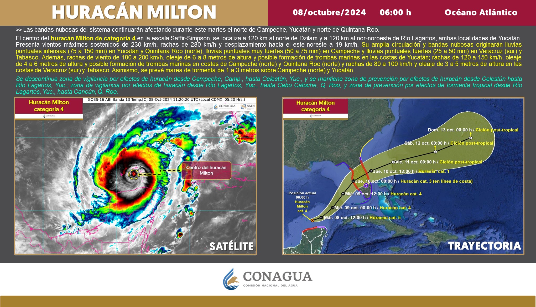 Según lo mencionado por la Comisión Nacional del Agua (CONAGUA) y el Servicio Meteorológico Nacional (SMN), a las 06:15 horas (tiempo del centro de México), el huracán Milton actualmente es categoría 4 en la escala Saffir-Simpson.