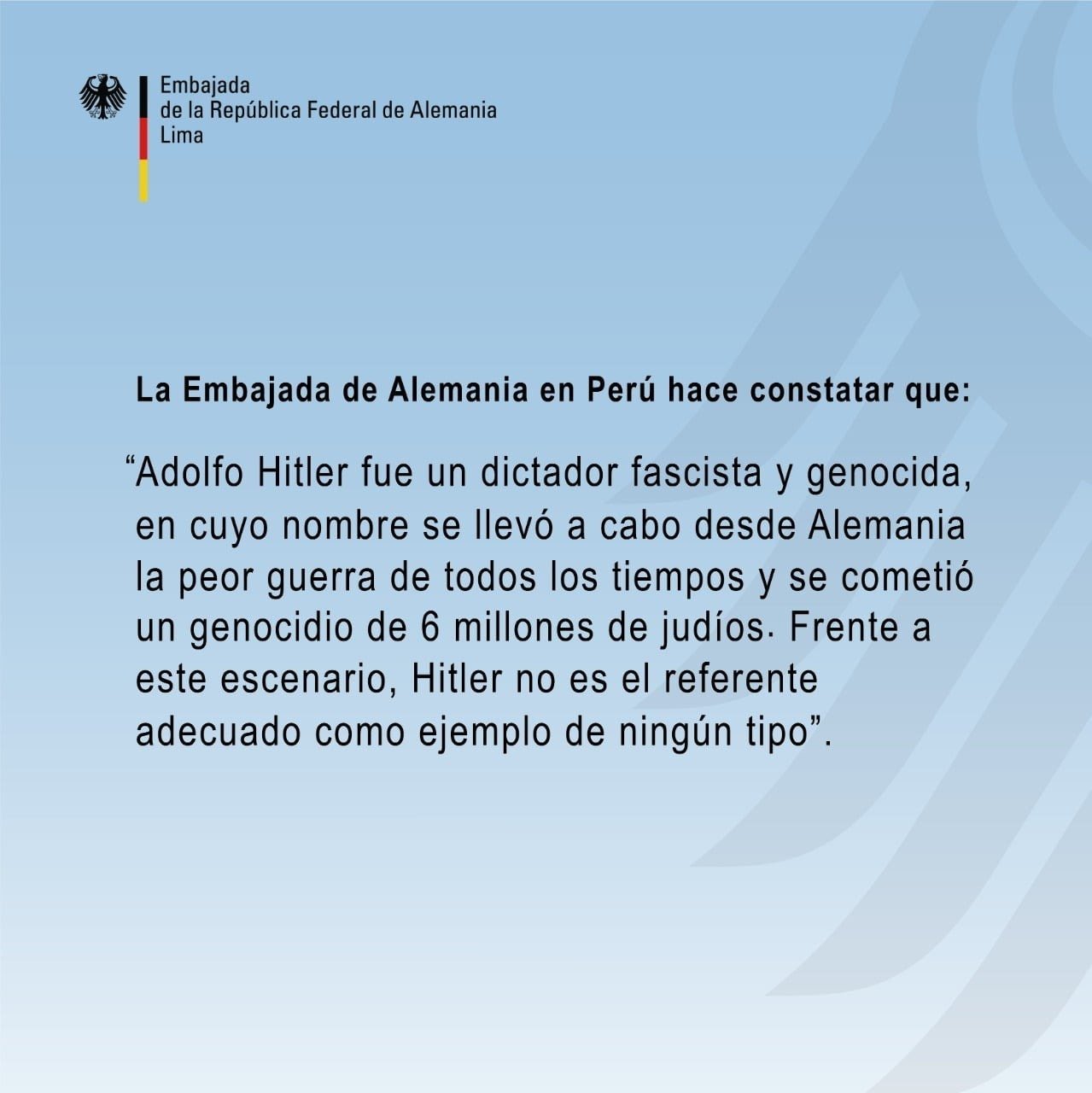 "Hitler fue un dictador fascista y genocida, en cuyo nombre se llevó a cabo desde Alemania la peor guerra de todos los tiempos y se cometió un genocidio de 6 millones de judíos. Frente a este escenario, Hitler no es referente adecuado como ejemplo de ningún tipo", dijo la legación germana en su página de Facebook.