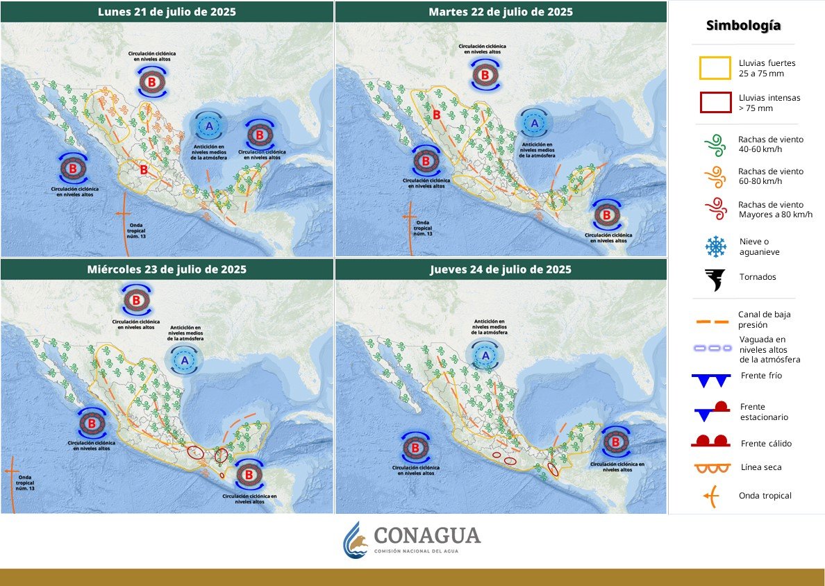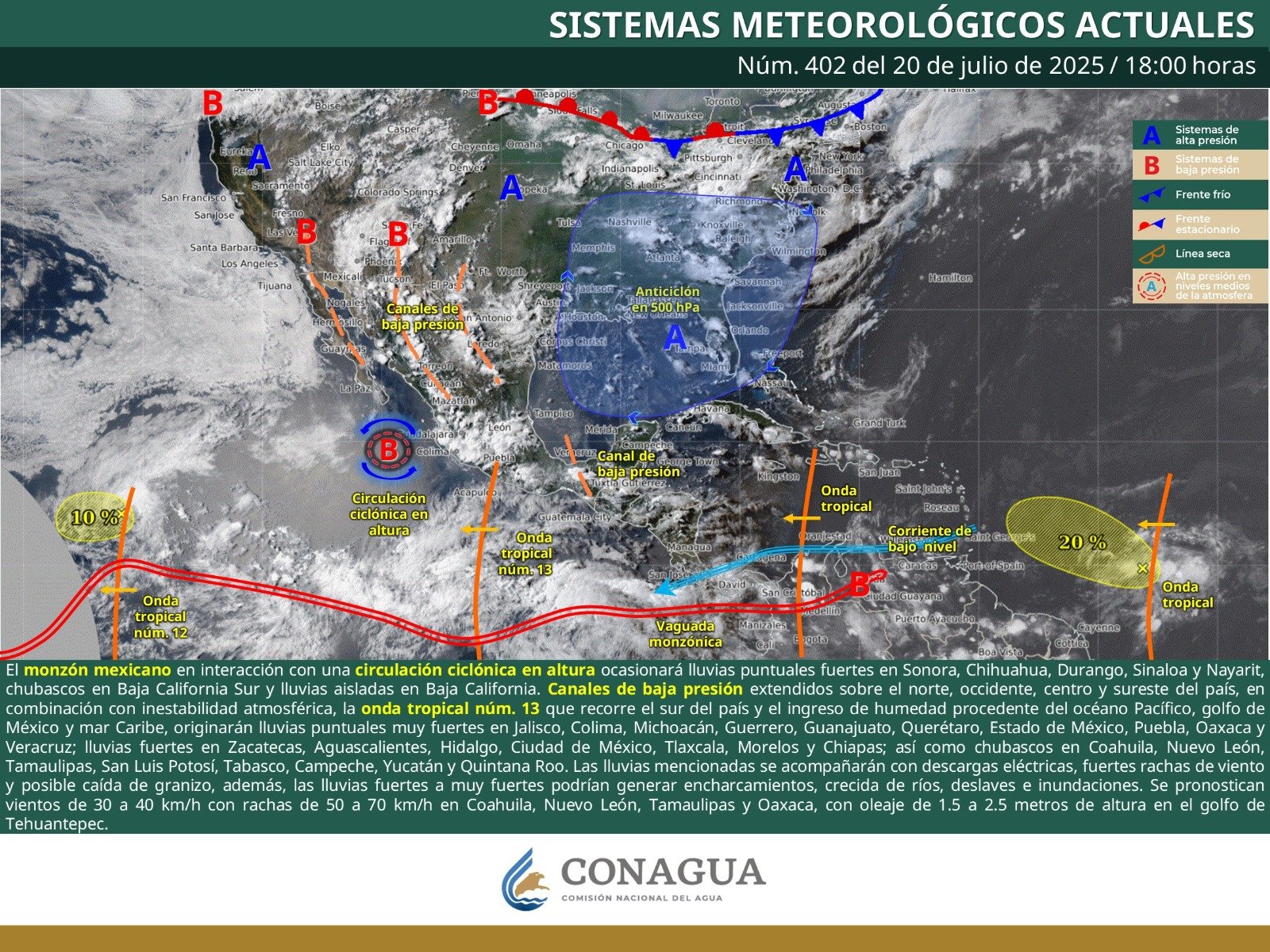 Por otro lado, canales de baja presión localizados en el norte, occidente, centro y sureste del país, en combinación con la onda tropical núm. 13, así como el ingreso de humedad proveniente del océano Pacífico, golfo de México y mar Caribe, ocasionarán: