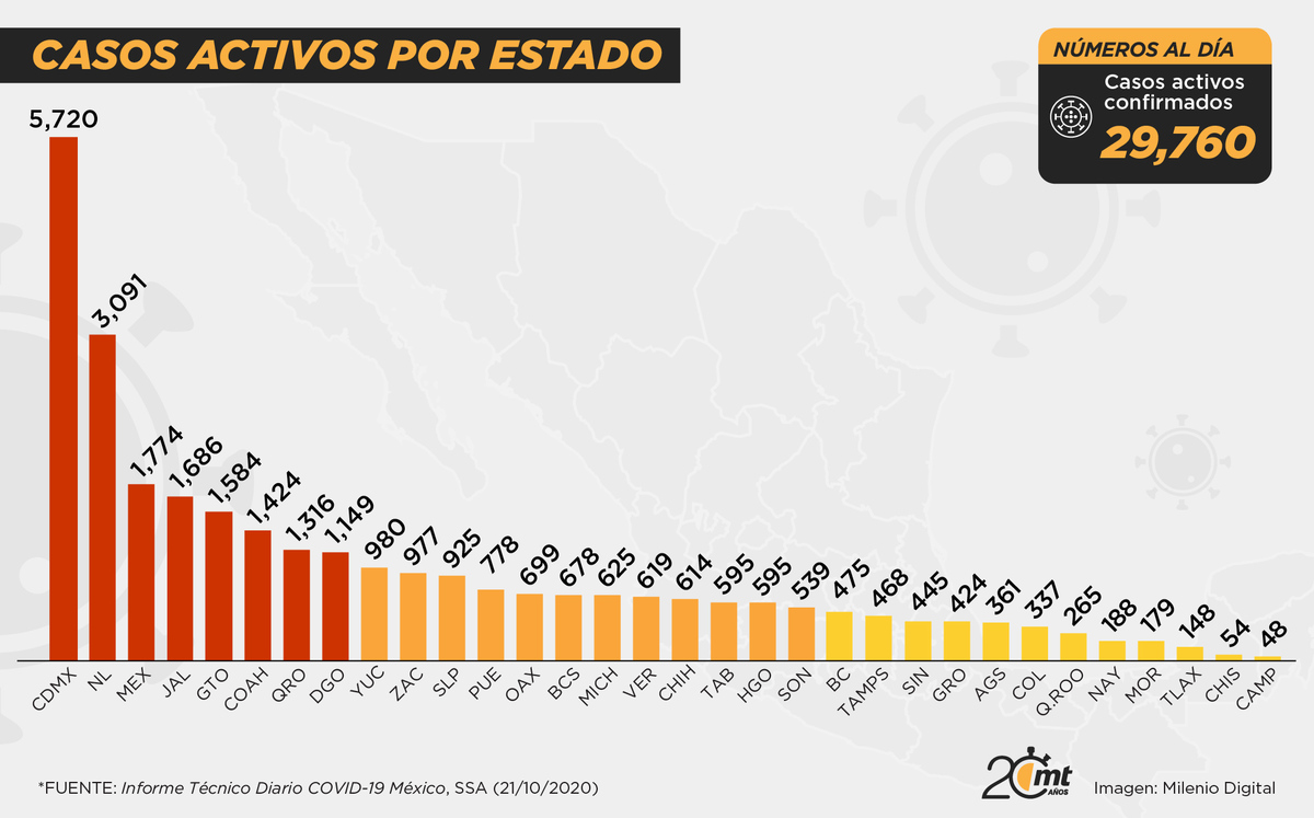 La Ciudad de México se mantiene en la cima del listado con 5 mil 720 casos activos en las últimas 24 horas, por delante de entidades como Nuevo León, Estado de México, Jalisco y Guanajuato.