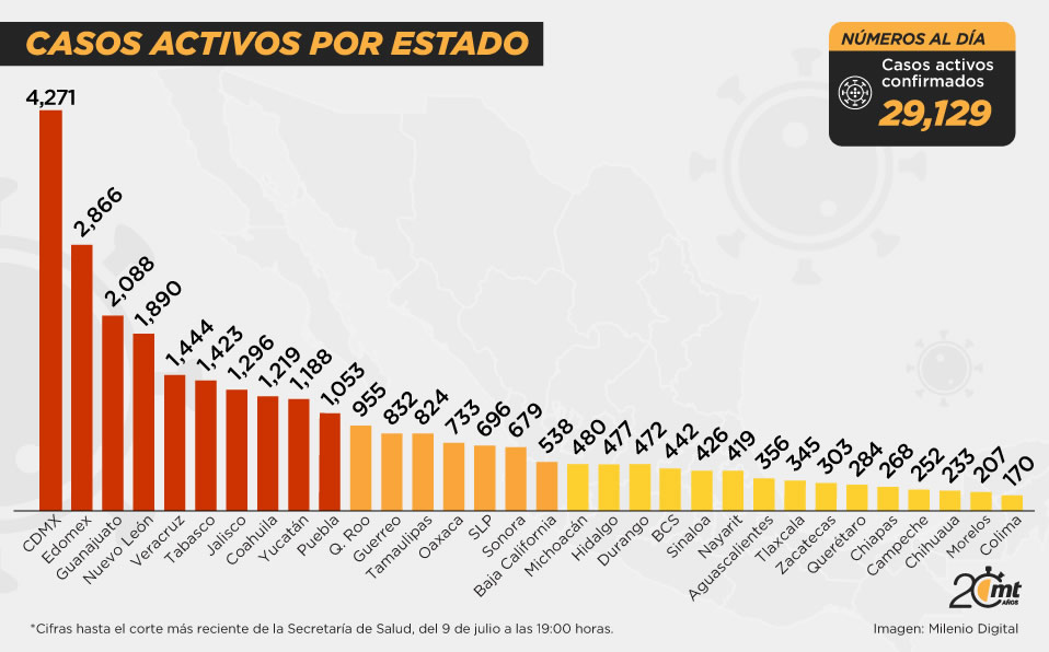 La Ciudad de México es la entidad con mayor número de casos positivos activos con 4 mil 271, seguida del Estado de México con 2 mil 866. Guanajuato, Nuevo León y Veracruz completan las cinco primeras posiciones.