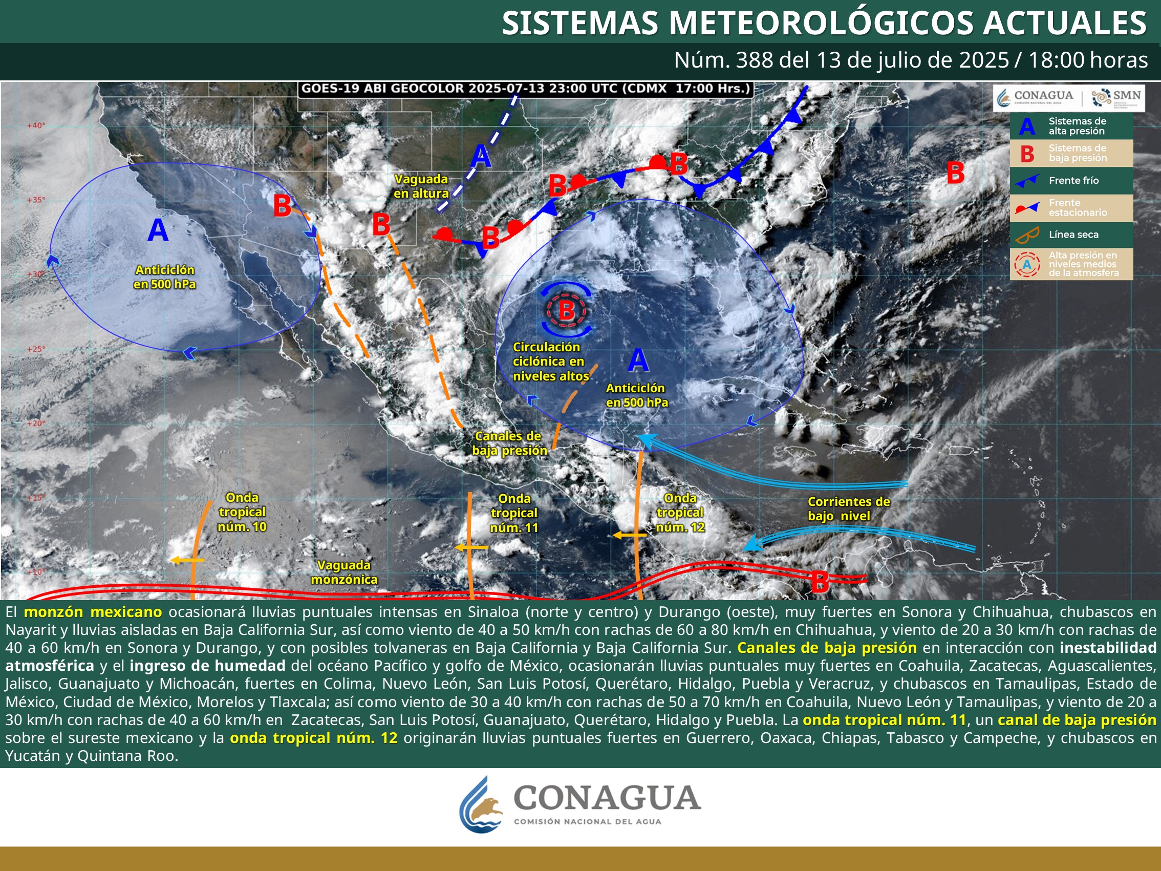 Durante la noche y madrugada del lunes, el monzón mexicano ocasionará lluvias puntuales intensas en el norte y centro de Sinaloa, así como en el oeste de Durango, y lluvias muy fuertes en Sonora y Chihuahua, acompañadas de vientos intensos y posibles tolvaneras en Baja California y Baja California Sur.