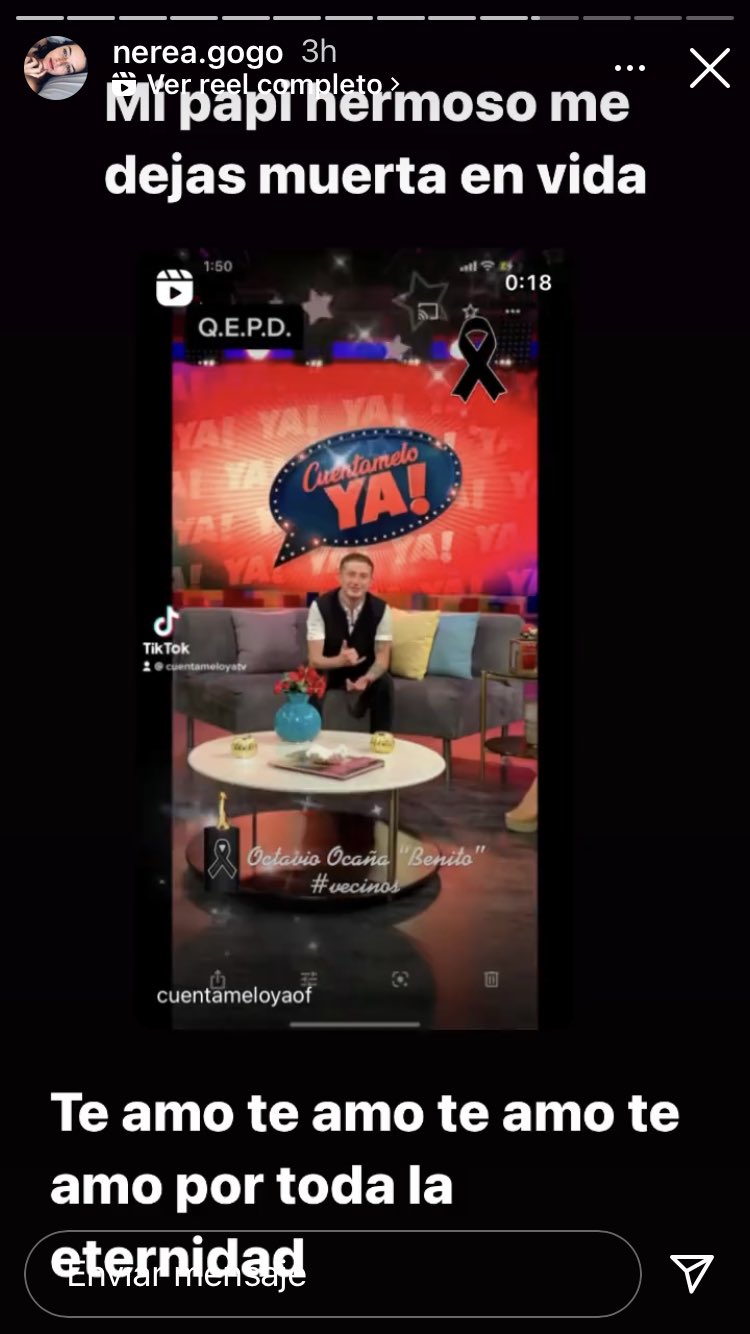 "Mi papi hermoso, me dejas muerta en vida. Te amo, te amo, te amo, por toda la eternidad", fue el primer mensaje que publicó Nerea Godínez, con quien hace unos meses Ocaña se comprometió.