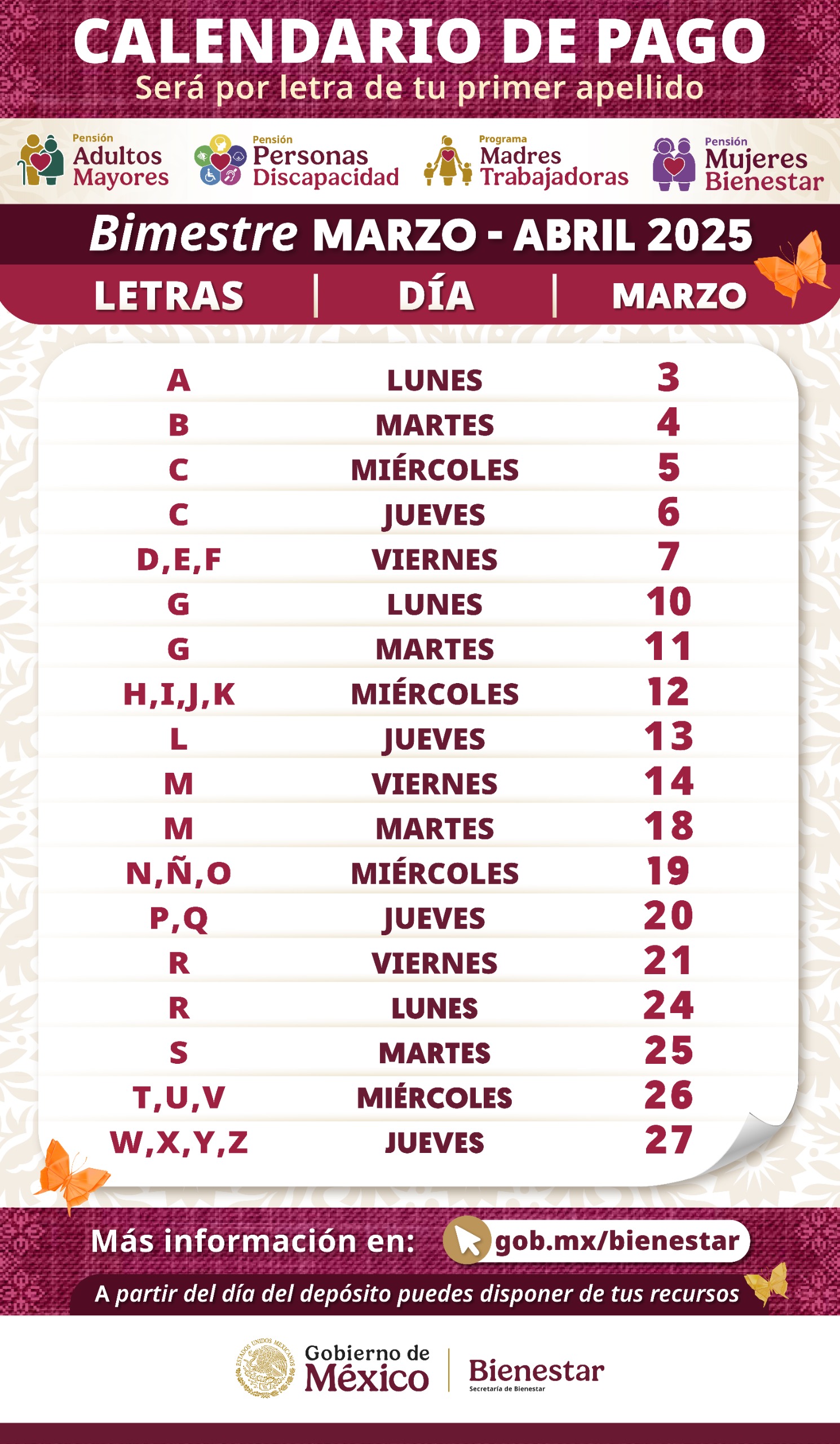 Las personas que sean beneficiaras de la Pensión del Bienestar de Adultos Mayores, Personas con Discapacidad, Madres trabajadores y la Pensión Mujeres Bienestar, recibirán esta semana los pagos respectivos al segundo bimestre de este 2025.