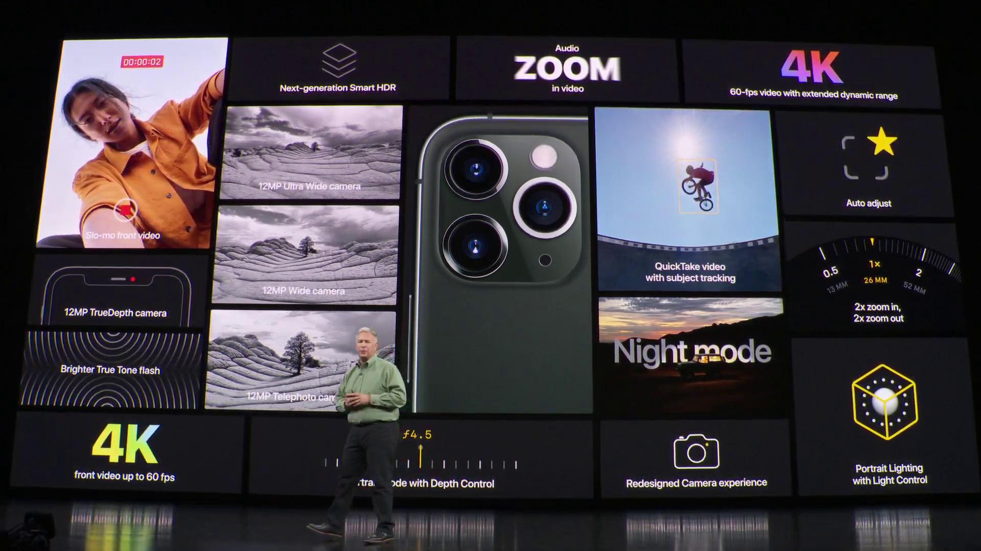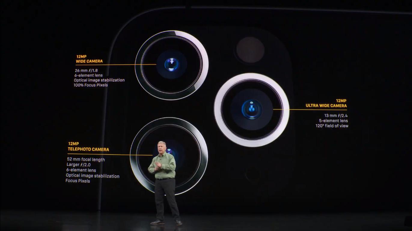 13:26 - Las cámaras del iPhone Pro están programadas de la siguiente manera: La primera (normal), la segunda es un telefoto y la tercera el esperado gran angular; todas estas con una mejor autonomía.