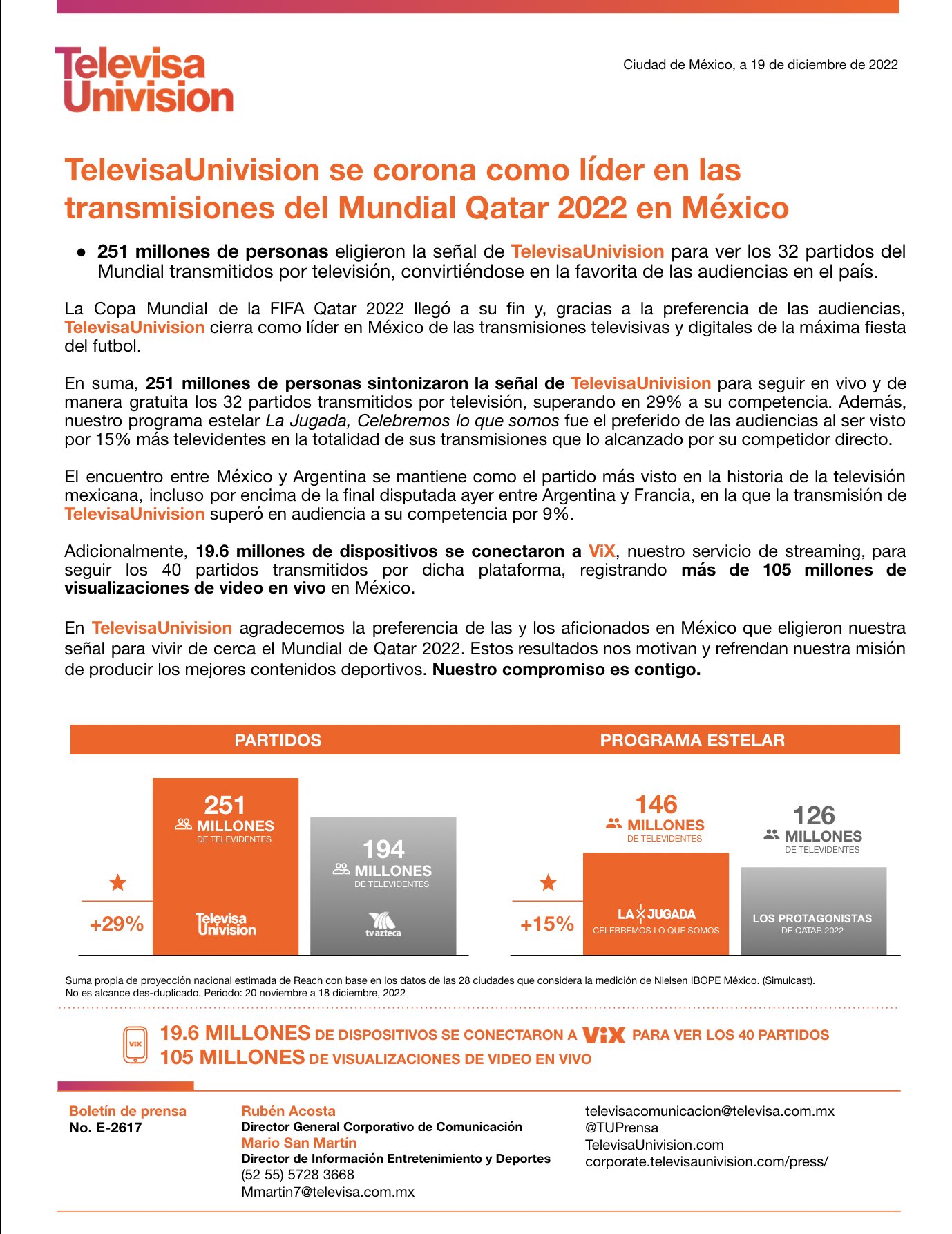 Según información publicada por Televisa-Univison, la televisora perteneciente a Emilio Azcárraga acumuló un total de 251 millones de espectadores, mientras que TV Azteca tuvo 194 millones.