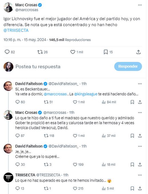 "Sí, es Beckenbauer…Ya vete a dormir, @marccrosas. La @kingsleague te está haciendo daño", respuesta que ocasionó que Crosas le recordara a Faitelson el día que Cuauhtémoc Blanco lo agredió en el estadio de Veracruz.