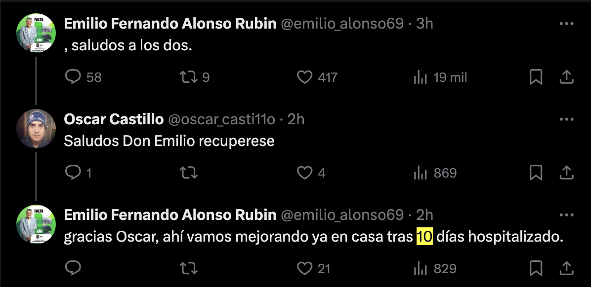 "Ya en casa dado de alta afortunadamente, listo para seguir mi rehabilitación y comenzar a trabajar nuevamente", "Sus buenos deseos me motivan a seguir adelante", "Mi salud mejoró y narrar ha sido mi vida, seguiremos mientras haya facultades y salud para hacerlo bien", son algunos de los posteos que compartió Emilio como respuesta a los mensajes del público.