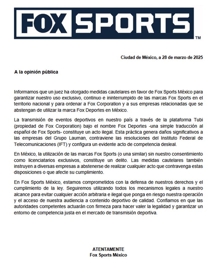 Fox Sports, por medio de un comunicado, anunció que recibió "medidas cautelares a su favor' por parte de un juez, con lo cual podrán seguir haciendo uso exclusivo, continuo e ininterrumpido de las marcas Fox Sports.