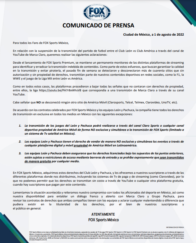 "En Fox Sports México, adquirimos estos derechos de Club León y Pachuca, y lo ofrecemos a nuestros suscriptores a través de las diferentes plataformas donde nos distribuimos, incluyendo los sistemas de Tv de paga y de streaming (como Clarovideo), por lo que no podemos permitir que los derechos se transmitan sin costo a través de YouTube o cualquier otra plataforma gratuita, cuando hay suscriptores que pagan por este contenido", apuntan en su comunicado.