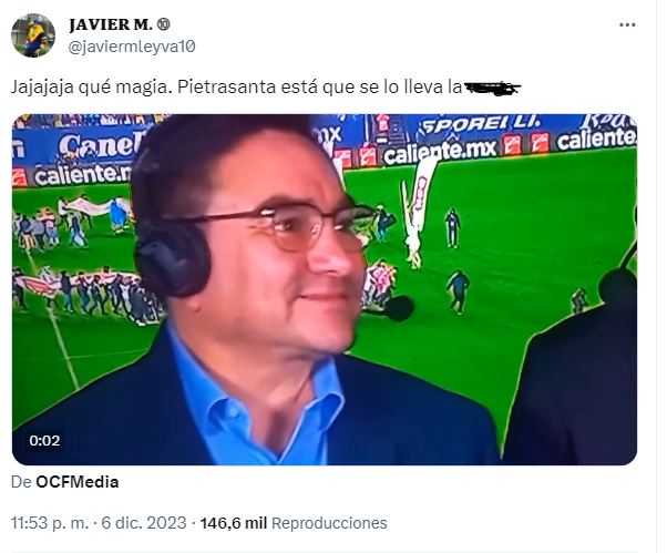 "Es extraordinario escuchar en una transmisión de futbol al Tuca y Gómez Junco, lastima que está el wey de Pietrasanta narrando"; "No tienen otros narradores menos mediocres o mejores que Pietrasanta"; "como dice ma... Pietrasanta"; "Toca escuchar los gritos de histérico de Pietrasanta".