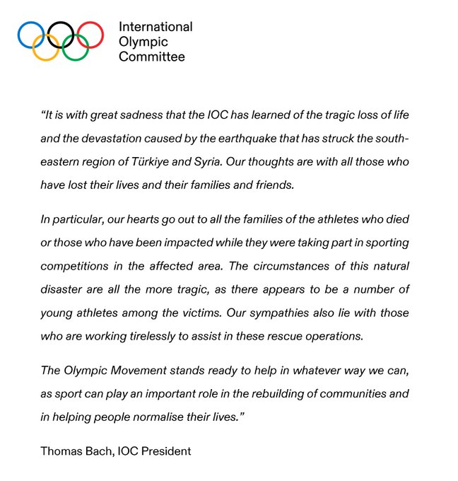 "Es con gran tristeza que el COI se ha enterado de la trágica pérdida de vidas y la devastación causada por el terremoto que ha golpeado la región sureste de Türkiye y Siria. Nuestros pensamientos están con todos aquellos que han perdido sus vidas y sus familias y amigos.