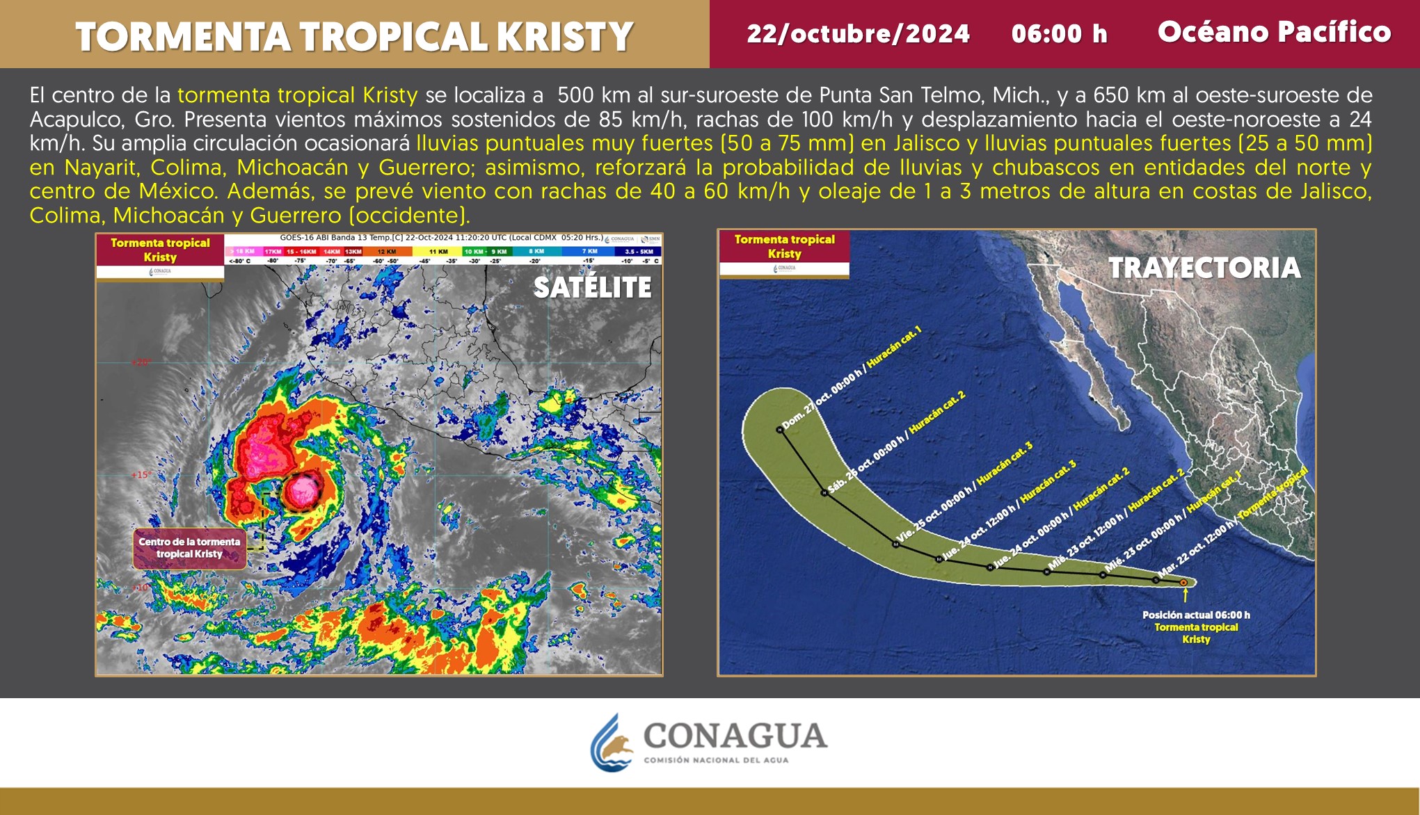 A las 06:00 horas (tiempo del centro de México) el centro de la tormenta tropical Kristy se localizaba al sursuroeste de las costas de Michoacán, su amplia circulación originará lluvias fuertes a puntuales muy fuertes, vientos fuertes y oleaje elevado en estados del occidente del país, además de reforzar la probabilidad de lluvias y chubascos en entidades del norte y centro del país.