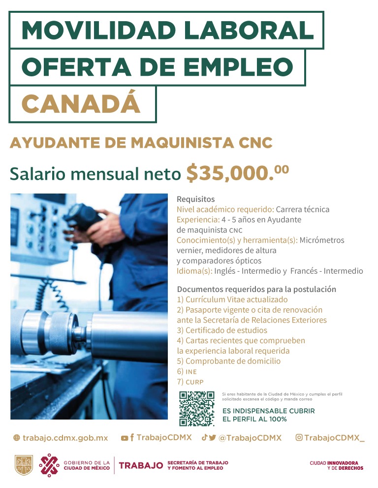 Para la vacante de ayudante de maquinista CNC se requiere un nivel académico de carrera técnica, de 4 a 5 años de experiencia en puesto similar, conocimientos en micrómetros vernier, medidores de altura y comparados ópticos. El sueldo mensual es de 35 mil pesos.