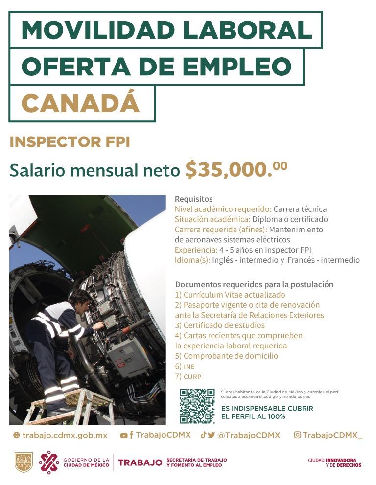 En el caso de la vacante para Inspector FPI se requiere un nivel académico de carrera técnica, experiencia en mantenimiento de aeronaves sistemas eléctricos y de 4 a 5 años de experiencia en puesto similar. El salario mensual es de 35 mil pesos.