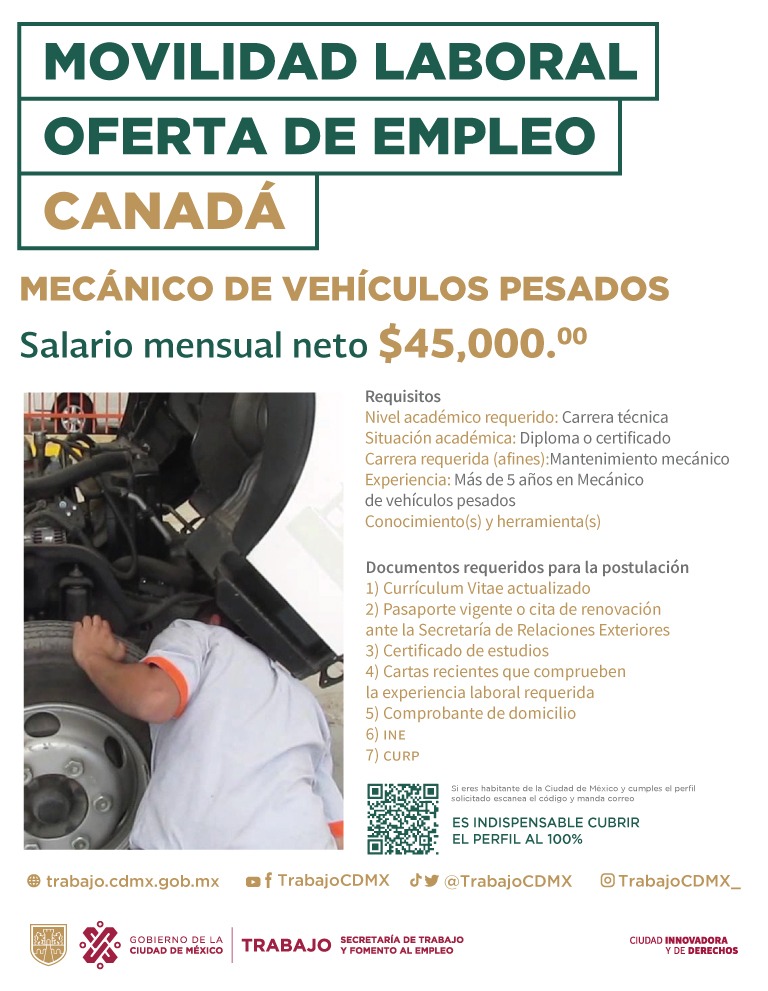 La vacante de mecánico requiere experiencia de cinco años en mantenimiento mecánico. Ofrecen un sueldo de 45 mil pesos mensuales y los documentos para postularte son INE, comprobante de domicilio, CV, cartas de recomendación y CURP, deben ser enviados al correo: candidadosptet@gmail.com