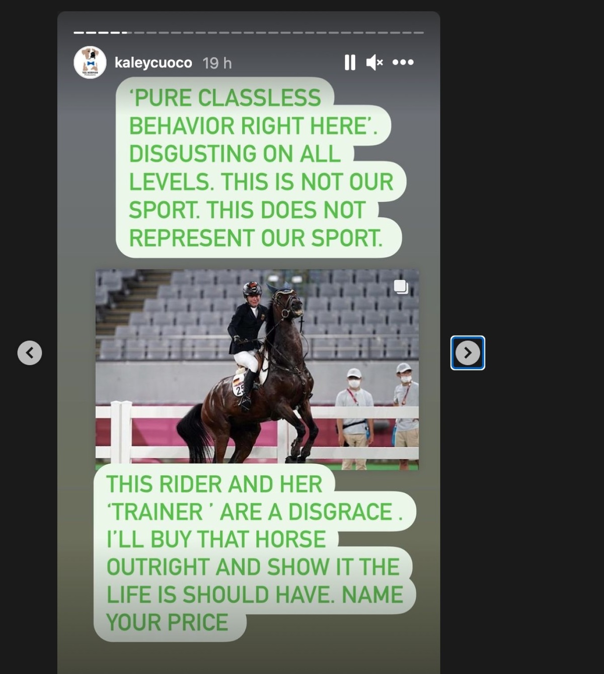 Tras la polémica en Tokio 2020, el pasado 7 de agosto, Kaley Cuoco se pronunció desde ese momento en contra de la entrenadora alemana que le pegó al caballo, argumentando que ‘era una vergüenza para el deporte’ y que claramente no sabía lo que era el respeto por los animales.