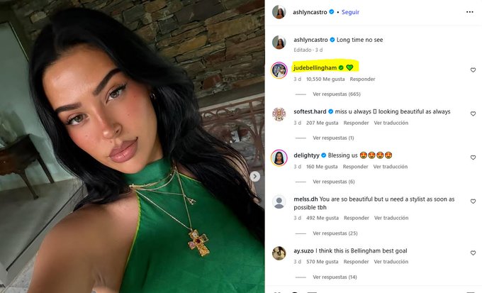 La sorpresa se dio cuando Bellingham reaccionó a la publicación con un corazón verde, emoji que suele usar la modelo y que incluso destaca en sus información de Instagram; Castro respondió al mensaje con un emoji de un beso.
